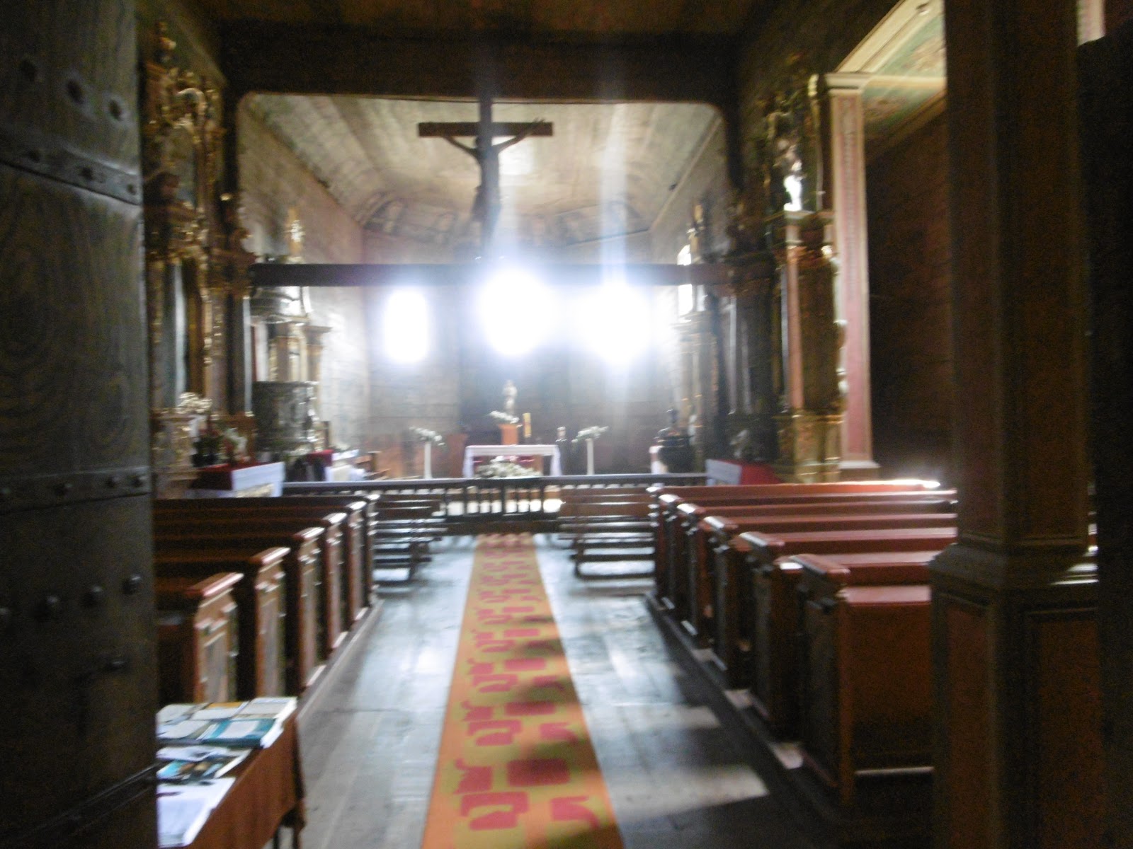 natürlich nicht vor (die Schilder sind auch schon etwas älter), aber ich habe zumindest erfahren, dass es eine Legende gibt, nach der die Kirche von der Hl. Jadwiga gestiftet wurde. Die kam nämlich mal in der Nähe des Ortes mit ihrem Wagen vom Weg ab und hat den Dorfbewohnern, die sie aus dem Sumpf zogen, dann einen Wald geschenkt, aus dessen Erlös die Kirche gebaut wurde. Und Kasimir der Große habe später der Familie Ekiert ein Privileg erteilt, die sich lange Zeit um die Kirche gekümmert habe. So ist von der ganzen Oral History nur die Familie