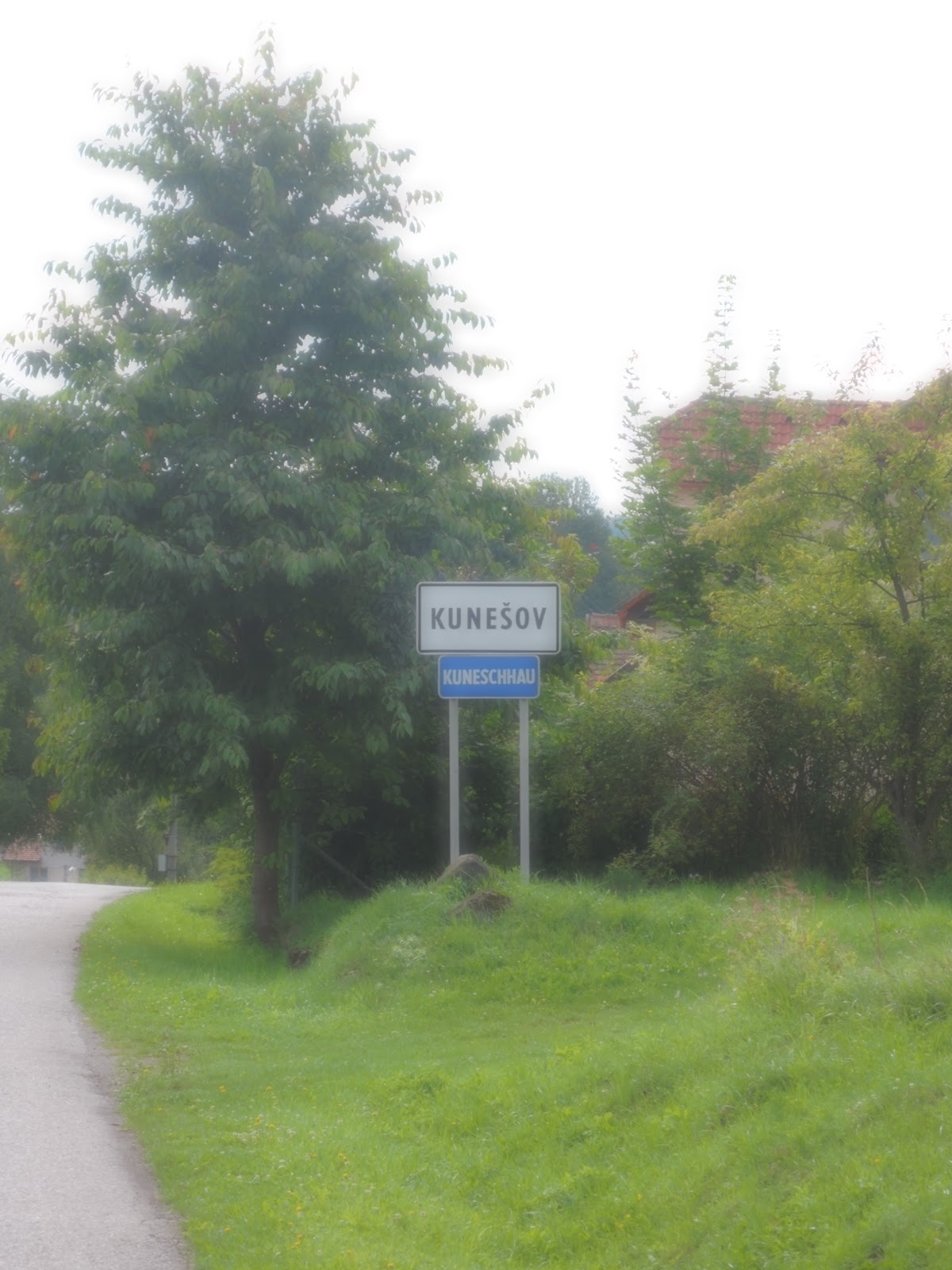 Die letzte Station im Hauerland sollte Kunešov/Kuneschhau sein, ein Ort, wo die Deutschen noch 18% der Bevölkerung ausmachen (von ca. 240 Bewohnern). Das liegt wohl daran, dass dort auch Deutsche im Widerstand gegen den Slowakischen Staat waren, diese wurden dann nach dem Krieg nicht vertrieben. – Auch dieser Ort liegt im Gebirge, gar nicht so weit von Sklené, aber man muss erst wieder ein Stück herunterfahren und dann wieder hinaus. In Kuneschhau ist das Deutsche auch tatsächlich sichtbarer, es gibt sogar ein zweisprachiges Ortsschild. Ansonsten waren kaum Leute auf der Straße, sodass ich weder lauschen noch jemand ansprechen konnte. Wie üblich fuhr ich dann zur Kirche und traf dort auf ein Begräbnis, das gerade im Gange war. Als ich kam,