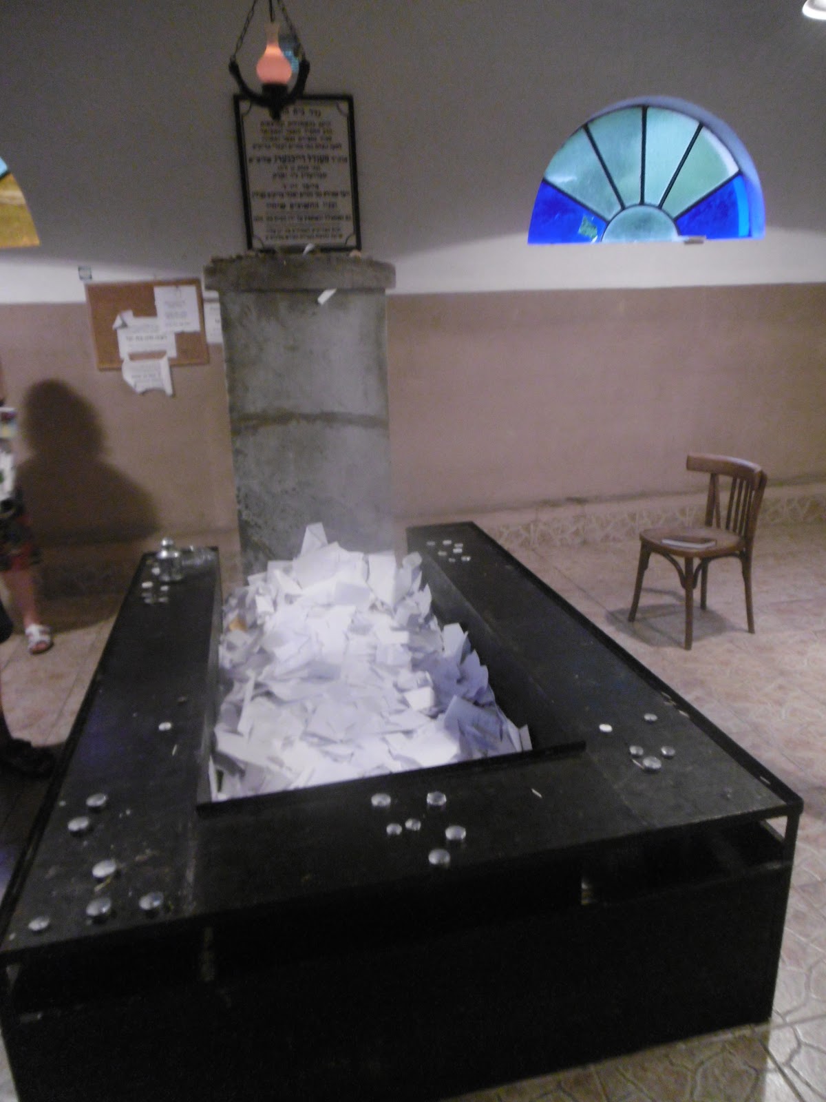 unterhalten hätten, wären nicht neue Besucher aufgetaucht, ein Ehepaar. Sie sprachen mit dem Verwalter Englisch, worauf er meinte, sein Englisch sei eher bescheiden, untereinander sprachen sie aber Deutsch. Ich habe sie dann angesprochen, es war ein Pfarrer aus Dresden mit Frau, wie sich später herausstellte, auf der Rückreise von Kiew. Und so habe ich dann die beiden geführt und verzweifelt versucht, möglichst viel von dem, was ich selbst gehört hatte, weiterzugeben. Dabei spielte dann auch eine Rolle, dass der Dresdner Pfarrer noch über deutlich mehr Kenntnisse zum Judentum verfügt als ich, er konnte z.B. auch Texte lesen, während ich ja faktisch nur noch die hebräische Schrift beherrsche und kaum noch hebräische Wörter. Nach einiger Zeit gesellten sich auch noch Israelis zu uns, die wiederum der Verwalter auf Iwrit führte. Sie waren laut und fröhlich und begannen gleich zu fotografieren – da habe ich mich dann auch getraut, nachdem ich mich vorher zurückgehalten hatte. Die Israelis bestiegen auch die Bima und hoben den Vorgang, hinter dem die Thorarolle sein müsste. Dort war auch eine Buchrolle, aber mit den Büchern der Propheten.