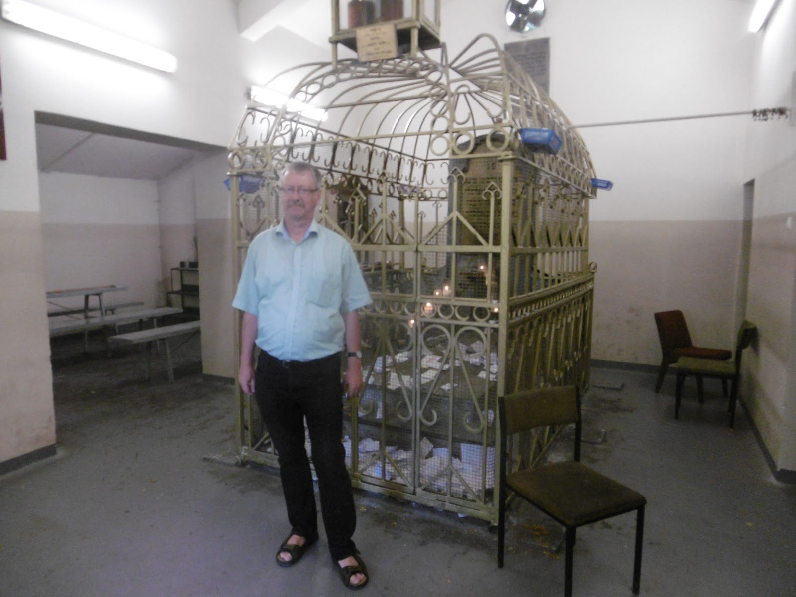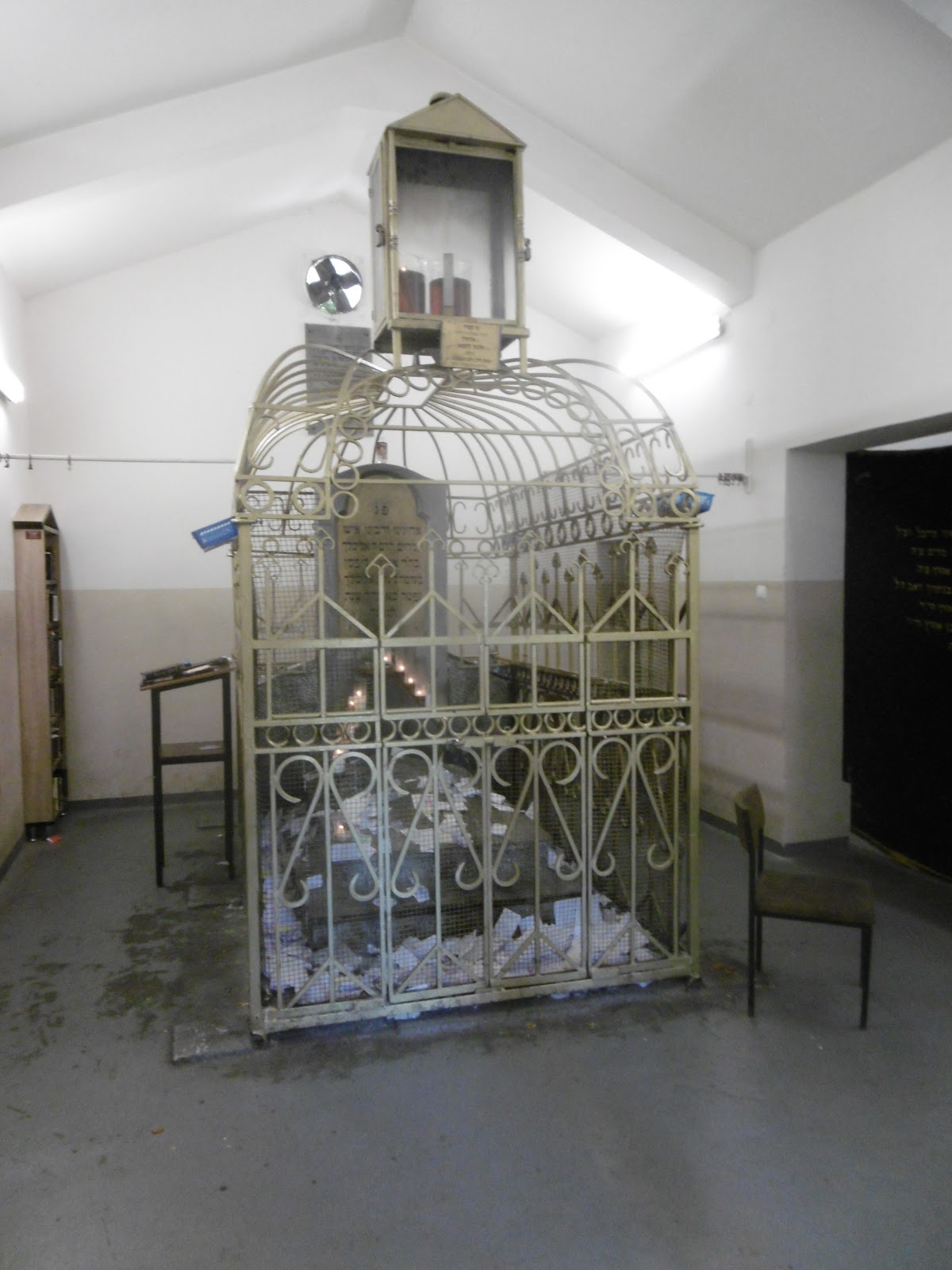Jiddisch geführt, mit englischen Einsprengseln (z.B. sagte er immer cemetery, was auch gut zu verstehen ist, denn im Jiddischen verwendet man hier hebräische Ausdrücke). Sein Jiddisch war sehr gut verständlich und dem Deutschen ziemlich nahe, vermutlich eine Art Hochjiddisch. Wie er sagte, versteht er das poilische Jiddisch auch nicht so gut, seine Eltern seien aus Ungarn gekommen. Er hat mir dann den Ohel aufgeschlossen, in dem Rabbi Elimelech (1717–1787) liegt, der dritte große Rabbiner der Chassidim nach dem Begründer Baal Schem Tov und seinem Nachfolger Rabbi Dow Bär von Mesritsch. Elimelech von