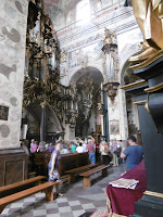 stellte ich fest, dass derselbe Pater eine große Gruppe führte – offenbar fangen hier Klosterführungen mit einer Andacht an. Die Kirche ist sehr schön ausgestattet, mit Fresken und der barocken Orgel, die auch noch aus dem 17. Jahrhundert stammt, über 6000 Pfeifen hat und angeblich eine der größten Orgeln