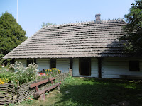 Von Przemyśl fuhr ich zurück in Richtung Łańcut, wollte aber unbedingt noch einen zweiten Versuch bei den „Walddeutschen“ in Markowa wagen, und sei es auch nur durch Besichtigung des Freilichtmuseums. Das war eine wunderschöne Fahrt durch kleine Dörfer und eine schöne Landschaft, leider gänzlich ohne Gaststätten oder Cafés, wo ich eigentlich gerne etwas getrunken hätte. Gegen 13:30 war ich dann in Markowa und stellte als erstes fest, dass in der Nähe des Freilichtmuseums gerade ein Festplatz hergerichtet wurde, zur Feier des Erntefestes („Dożynki“). Als ich kam, war aber noch gar nichts los, es stand nur die Bühne und es wurden Tische aufgestellt. Ich ging schnurstracks ins Freilichtmuseum – und erschrak zunächst vor der Ankündigung, die Besichtigung dauere 2-3 Stunden. Aber glücklicherweise gab es ja keine Führung, sondern nur individuelle Besichtigung. Die Kasse war ins Freie verlegt und an einem Tisch wurde mir eine Eintrittskarte für 4 Złoty verkauft, das war ein Sonderpreis, den aber an diesem Tag alle bekamen. Und ich wurde aufgefordert, mir nachher ein Andenken zu kaufen.
