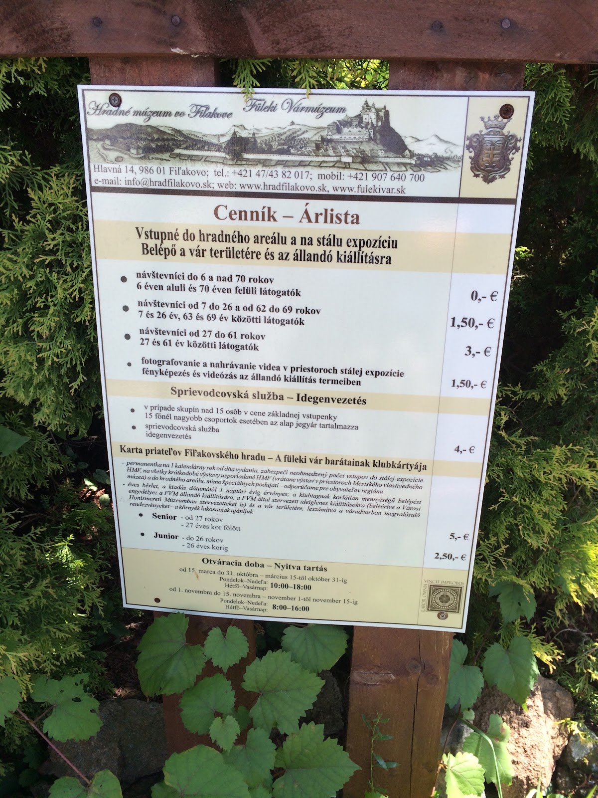 Aus der Stadt ging ich zurück ins Hotel, habe für 3 € zu Mittag gegessen und mich dann auf den Weg zur Burg gemacht. Dort faszinierte mich als erstes das Schild mit den Eintrittspreisen, auf dem man nämlich im slovakischen Text erfährt, dass Besucher/innen bis 61 voll zahlen und ab 62 reduziert, während im ungarischen Text die Ermäßigung erst ab 63 gewährt wird und man bis 61 voll zahlen muss. Die Frage, was mit 62-jährigen passiert, bleibt offen.