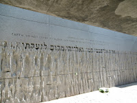 Stacheldraht nach oben. Er wird immer enger und endet mit einer kleinen Gedenkstätte an der Stelle, an der die Gaskammern standen. Und wenn man den Weg hinaufgeht, muss, ja soll man an die Scharen denken, die hier in den Tod getrieben wurden. In der Gedenkstätte steht dann auf Hebräisch, Polnisch und Englisch der Vers aus Hiob 16:18 „Ach Erde, bedecke mein Blut nicht! und mein Geschrei finde keine Ruhestätte!“. Zurück bin ich dann um das Gelände herumgelaufen, wo die Namen aller Ort stehen, aus denen Menschen nach Bełżec gebracht wurden. Unten ist dann ein Museum, angeblich in Form einer Rampe, jedenfalls an der Stelle, wo die Rampe war. Dort haben mich am meisten drei Vitrinen mit Schuhen, Schlüsseln und Geldstücken beeindruckt, die man bei Grabungen auf dem Gelände gefunden hat.