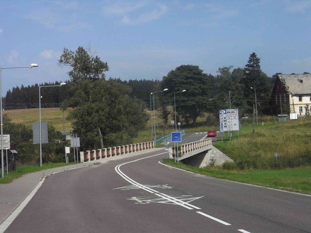 – und da führt dann eine funkelnagelneue Brücke über den Grenzfluss nach Polen. Auf der anderen Seite ging es genauso einsam weiter, hier führte die Straße an einem Berg namens Zieleniec vorbei (ich kannte bisher nur den gleichnamigen tschechischen Außenminister) und ich konnte wählen, ob ich nach Bystrzyca Kłodzka (Habelschwerdt) oder nach Duszniki Zdrój (Bad Reinerz) wollte – ich entschloss mich für die zweite Möglichkeit.