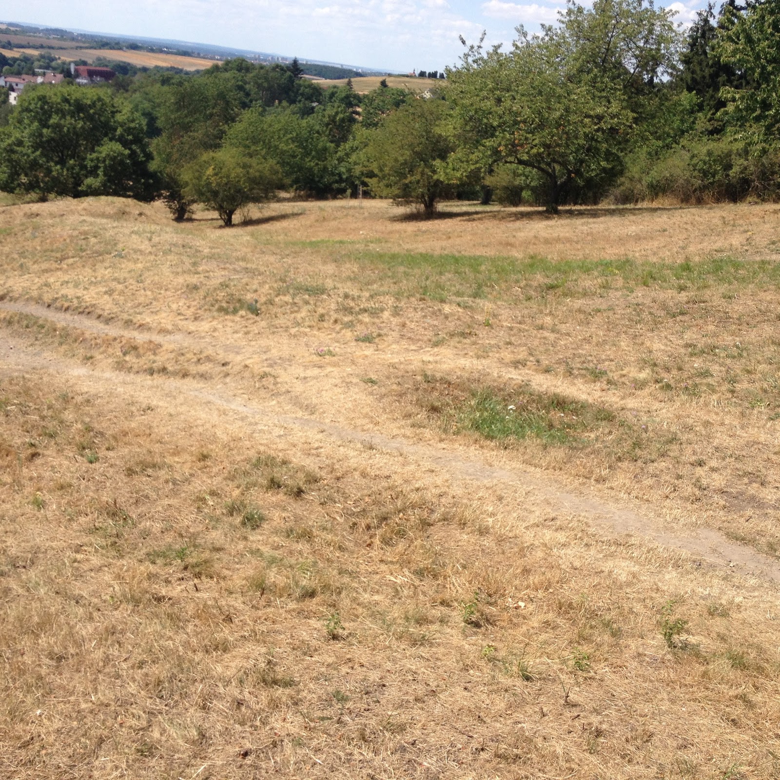 Gegen 13 Uhr war ich dann an der Grenze und bin weitergefahren bis Starý Plzenec, dem Ort, wo ich mir am 15. März das Bein gebrochen habe. Ich habe mein Auto an derselben Stelle wie damals abgestellt und bin den Hügel hinaufgelaufen zur Rotunde. Diesmal war es trocken und heiß, trotzdem konnte ich die Stelle des Sturzes identifizieren und fotografieren. Wider Erwarten war auch die Rotunde geöffnet, wegen einer Reisegruppe, die aber noch nicht da war. Und die Dame, die den Schlüssel hatte, ließ mich ohne Eintritt hinein – es sei ihr zu mühselig, mir eine Karte zu verkaufen. Die Rotunde ist auch innen eindrucksvoll, da im Originalzustand (also nicht verputzt). Am interessantesten fand ich den romanischen Kachelfußboden mit Tiermotiven, der freilich – so steht es im Prospekt – von 1976 ist. Da kann man dann nur hoffen, dass sie ihr Vorbild (angeblich ein Fußboden vom Vyšehrad) gut kopiert haben. – Beim Rückweg fiel mir dann auf, dass der Weg steiler ist, als ich in Erinnerung hatte, und viel kürzer. Aber woran dieser Eindruck liegt, ist ja wohl klar. Im März habe ich ja eine Dreiviertelstunde gebraucht, um zu meinem Auto zurückzuhumpeln.