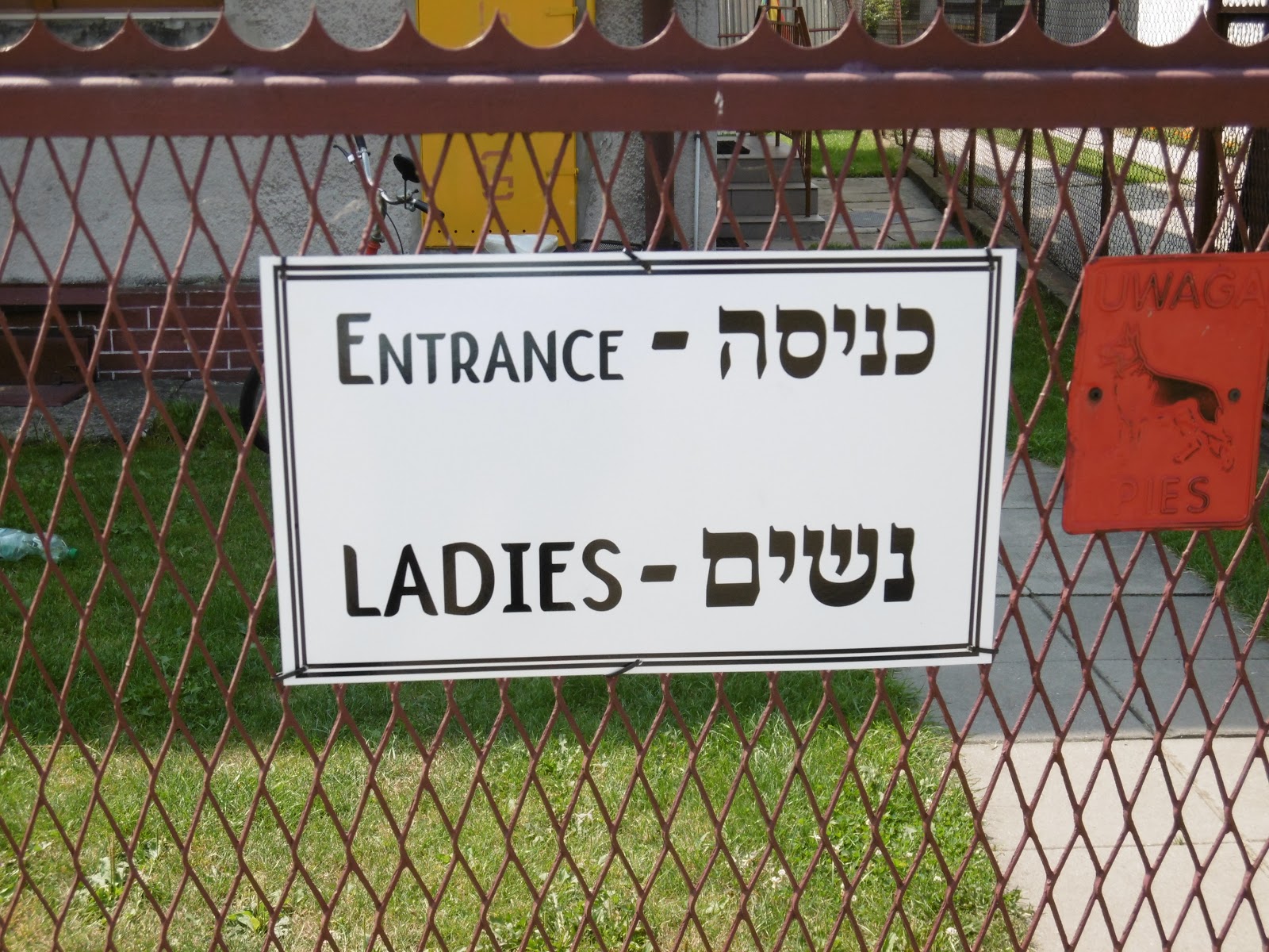 Gegen Abend bin ich dann noch einmal zum jüdischen Friedhof gegangen, in der Hoffnung, dass vielleicht jemand da ist, der den Schlüssel hat. Das Haus, in dem die betreffende Dame wohnen soll, liegt direkt gegenüber, aber erst jetzt habe ich realisiert, was die diversen Aufschriften in hebräischer Schrift aussagen. Offenbar müssen nämlich Männer von links und Frauen von rechts ins Haus (auf dem Schild für die Männer steht das auch auf Jiddisch, die Frauen werden dafür auf Englisch informiert!). Und das legt den Verdacht nahe, dass das